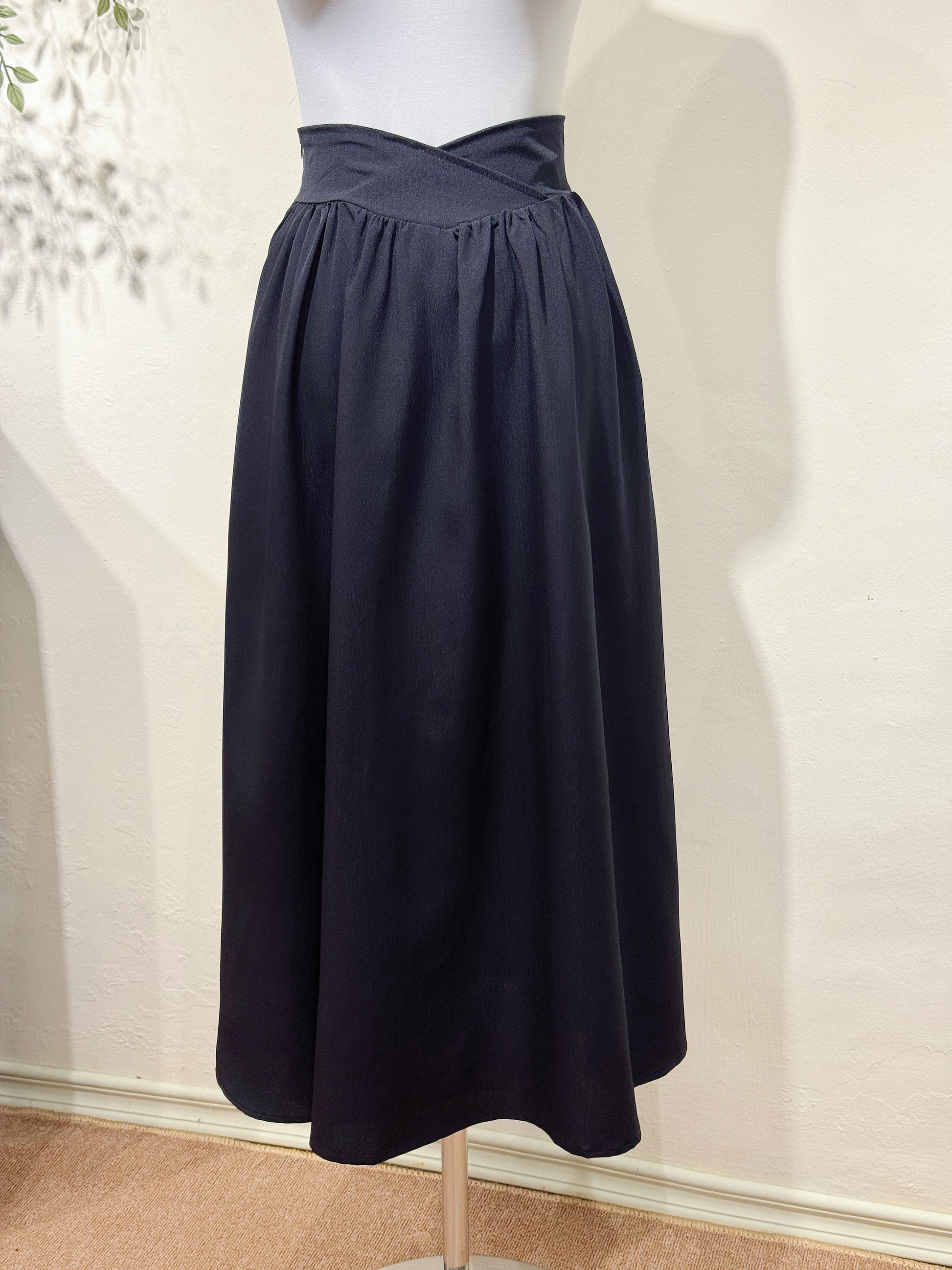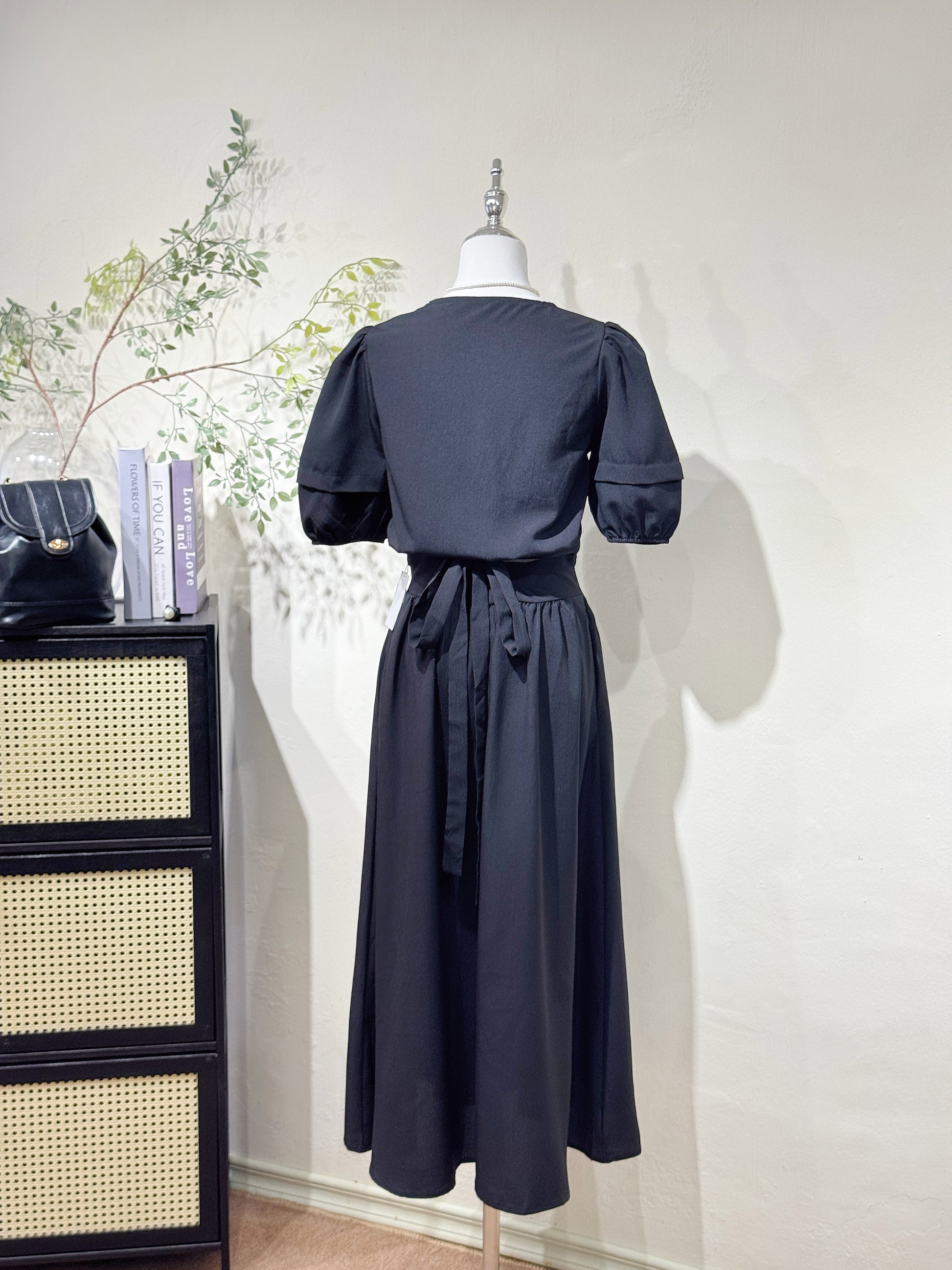 This elegant two-piece set features a black puff-sleeve top with a crossover V-neckline, elastic waist, and adjustable tie for a flexible fit. Paired with a mid-length skirt designed with a subtle elastic waist, hidden side zipper, and a voluminous flared hem, it creates a flattering and feminine silhouette. Perfect for chic daily wear or dressed-up occasions.