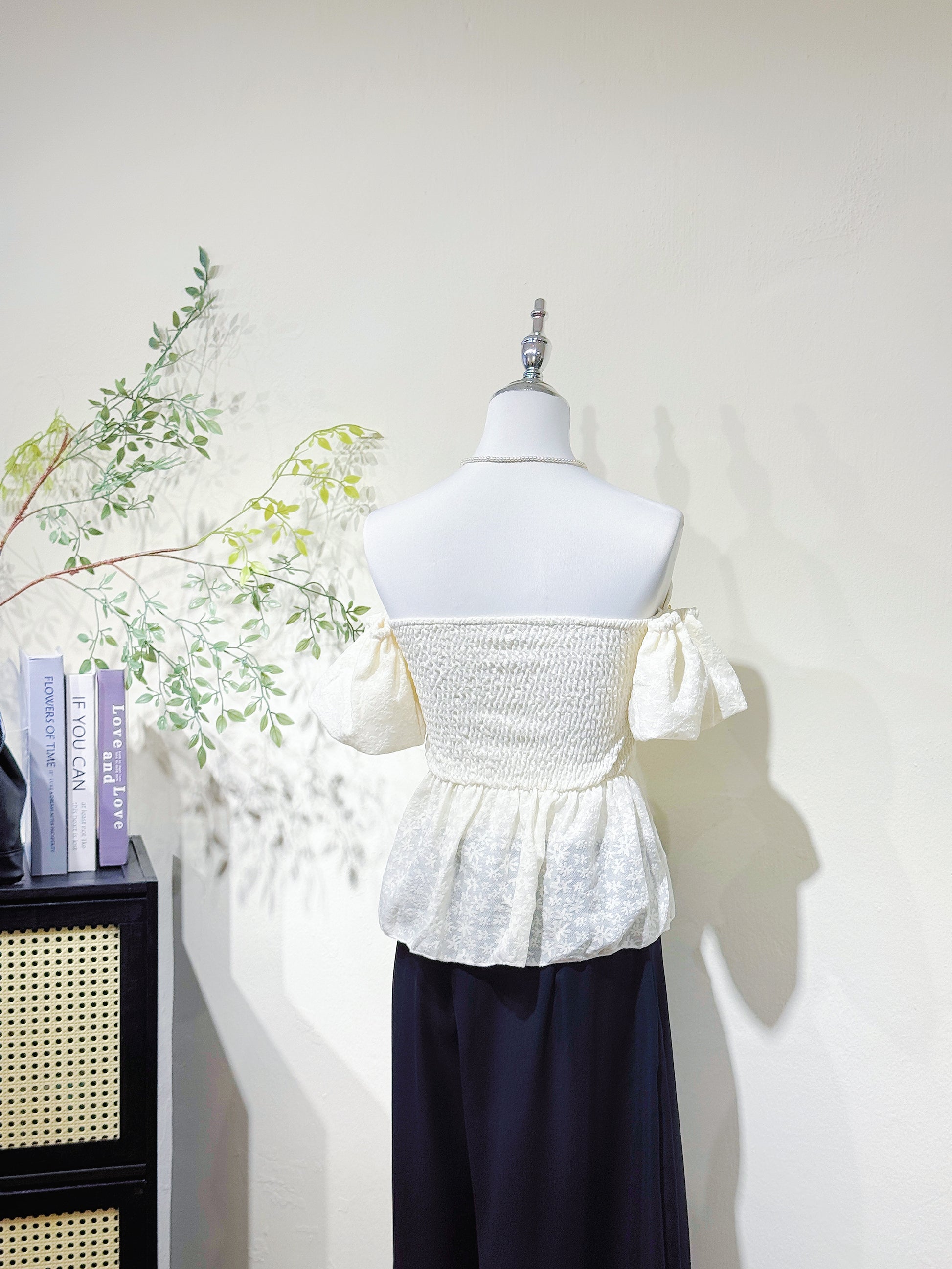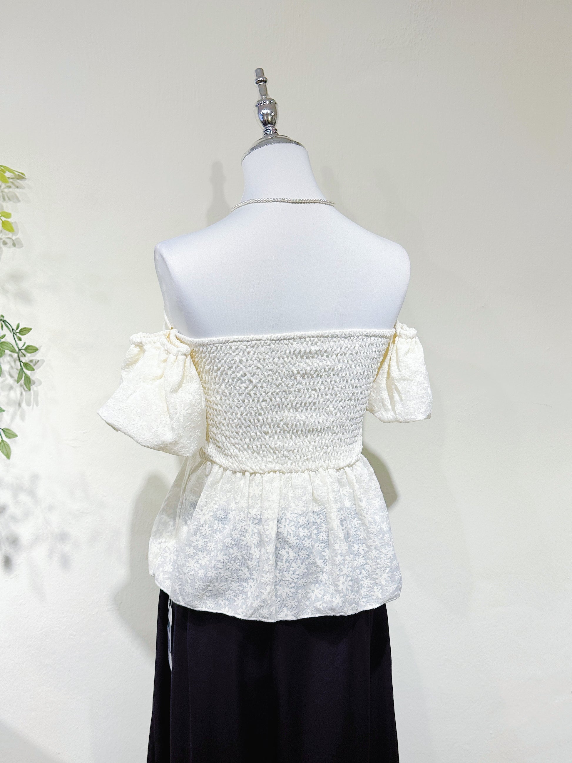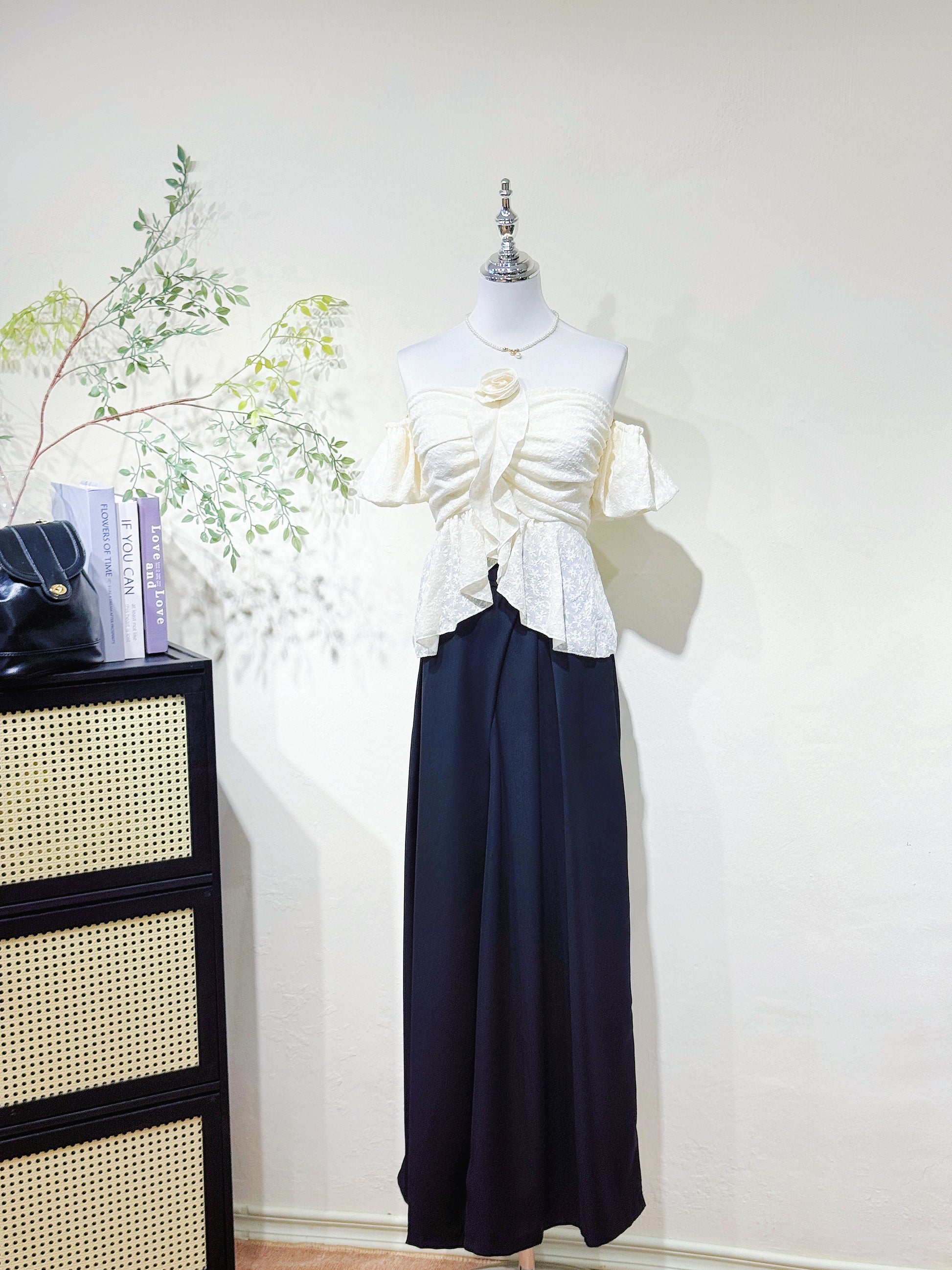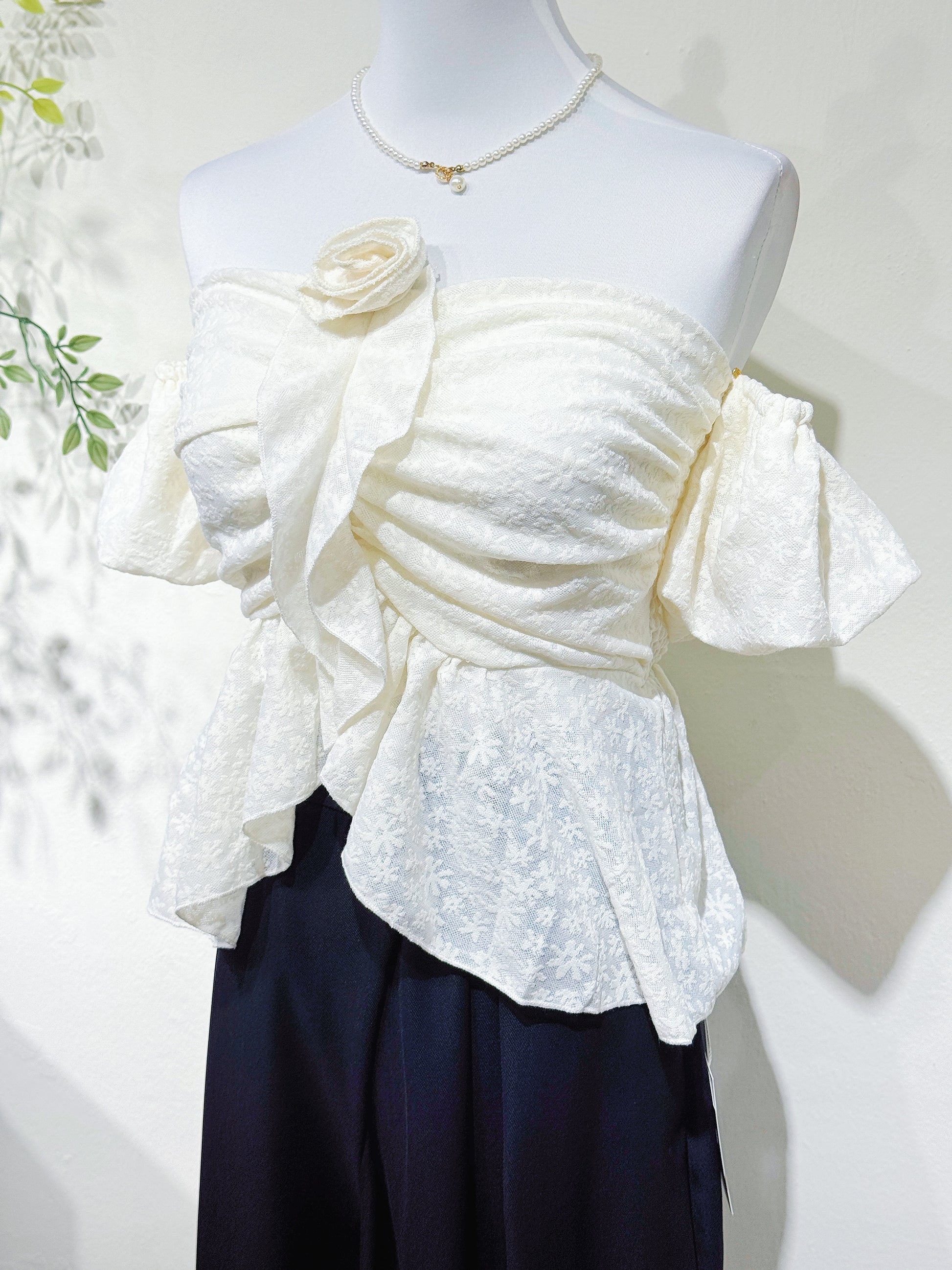 Delicately crafted from lace with an inner lining, this off-shoulder blouse features a bustier-inspired cut and flowy hem. The front is adorned with soft ruffles and a detachable rose brooch, while the back is designed with an open drape for a graceful finish. Romantic and feminine, perfect for both special occasions and chic everyday looks.