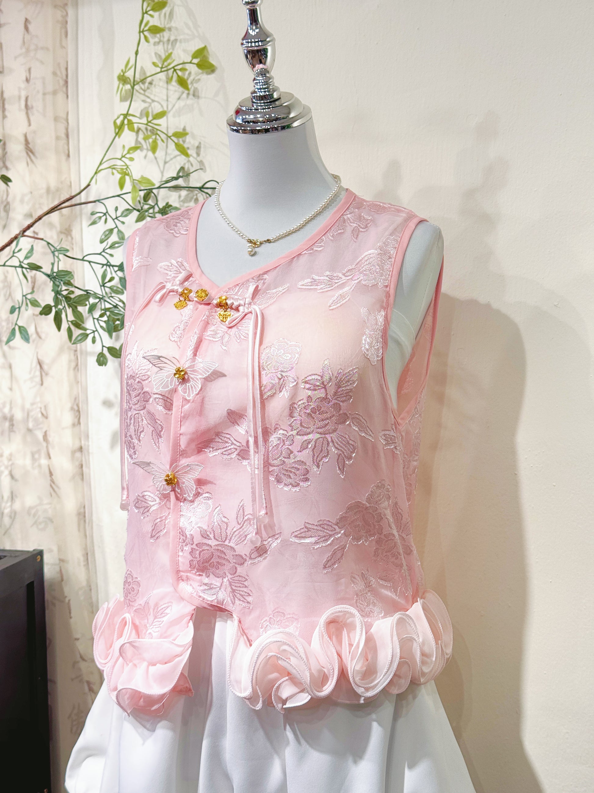 Sheer lace vest with petal-edge detailing, front Chinese knot buttons adorned with tassels and lace butterfly accents. Comes with a white camisole inner for comfortable wear.