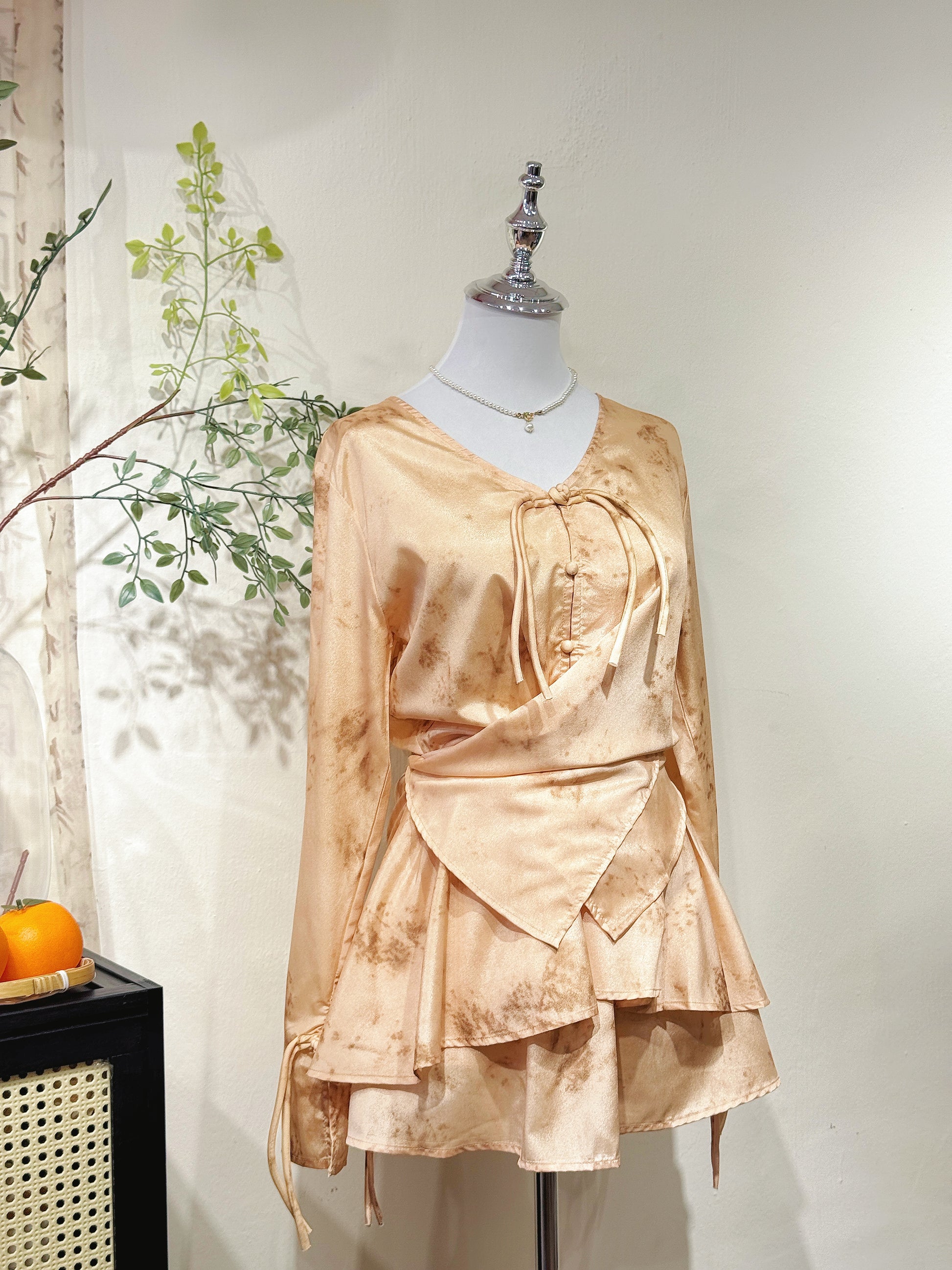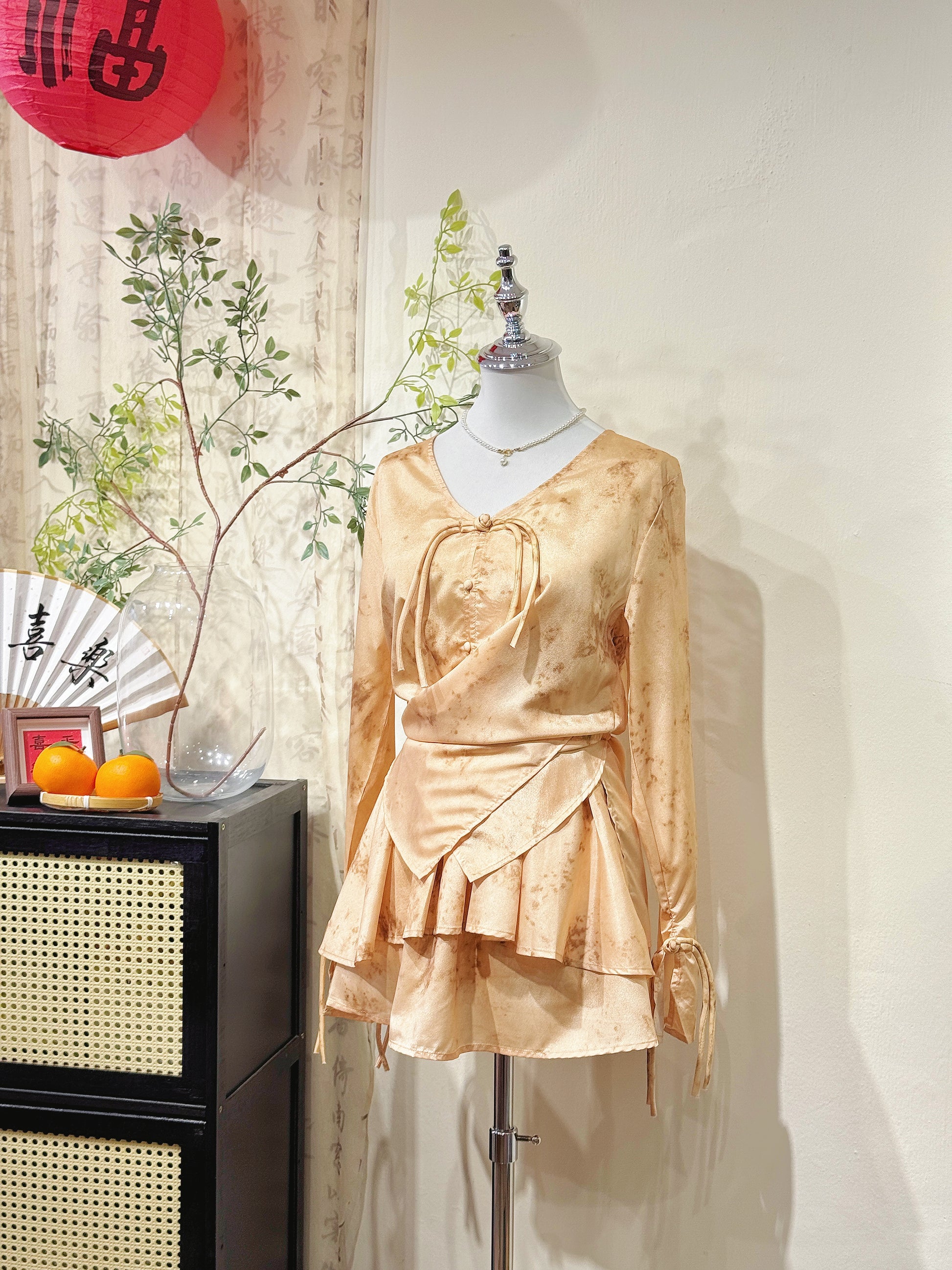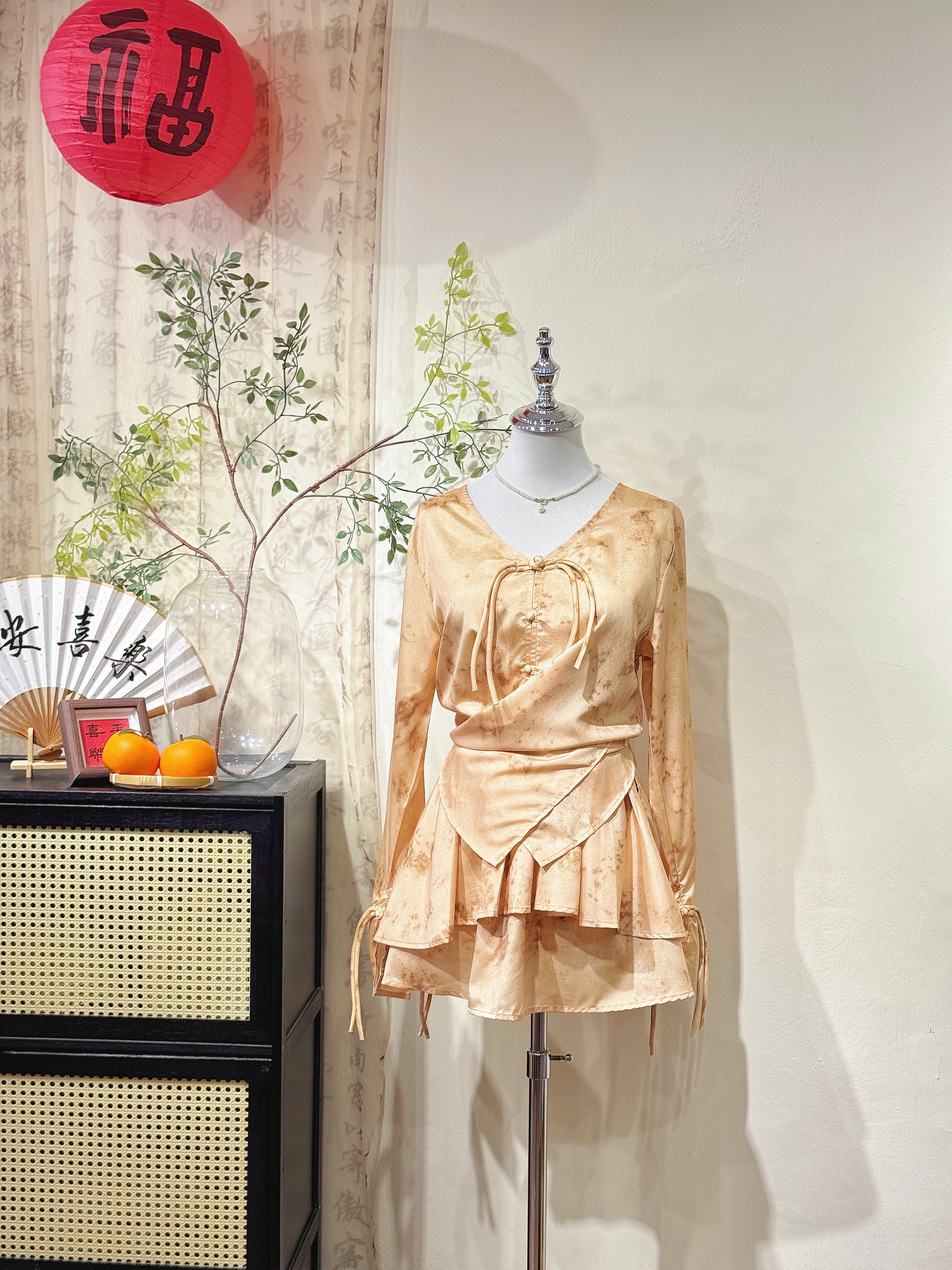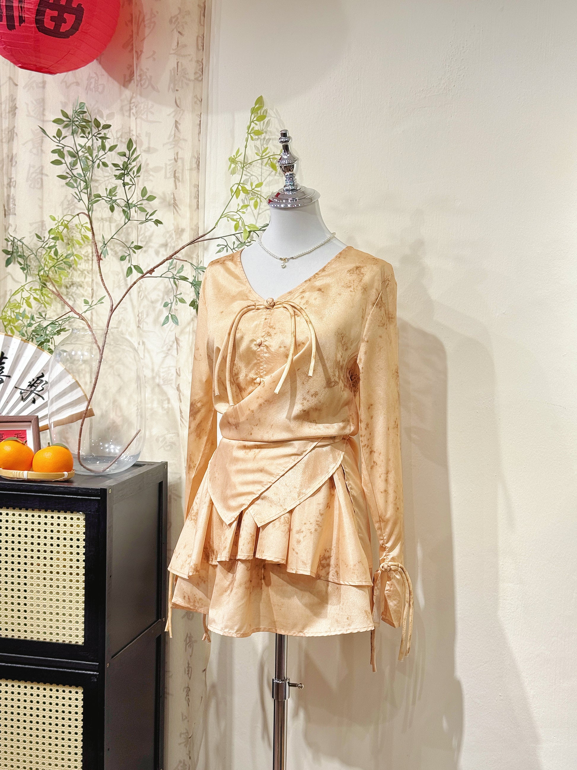 Long-sleeve V-neck top with front button closure and tassel-accented Chinese knot buttons on the sleeves. Features a long, wrap-back hem. Comes with a skirt featuring elastic waistband and inner shorts lining for comfort and coverage.