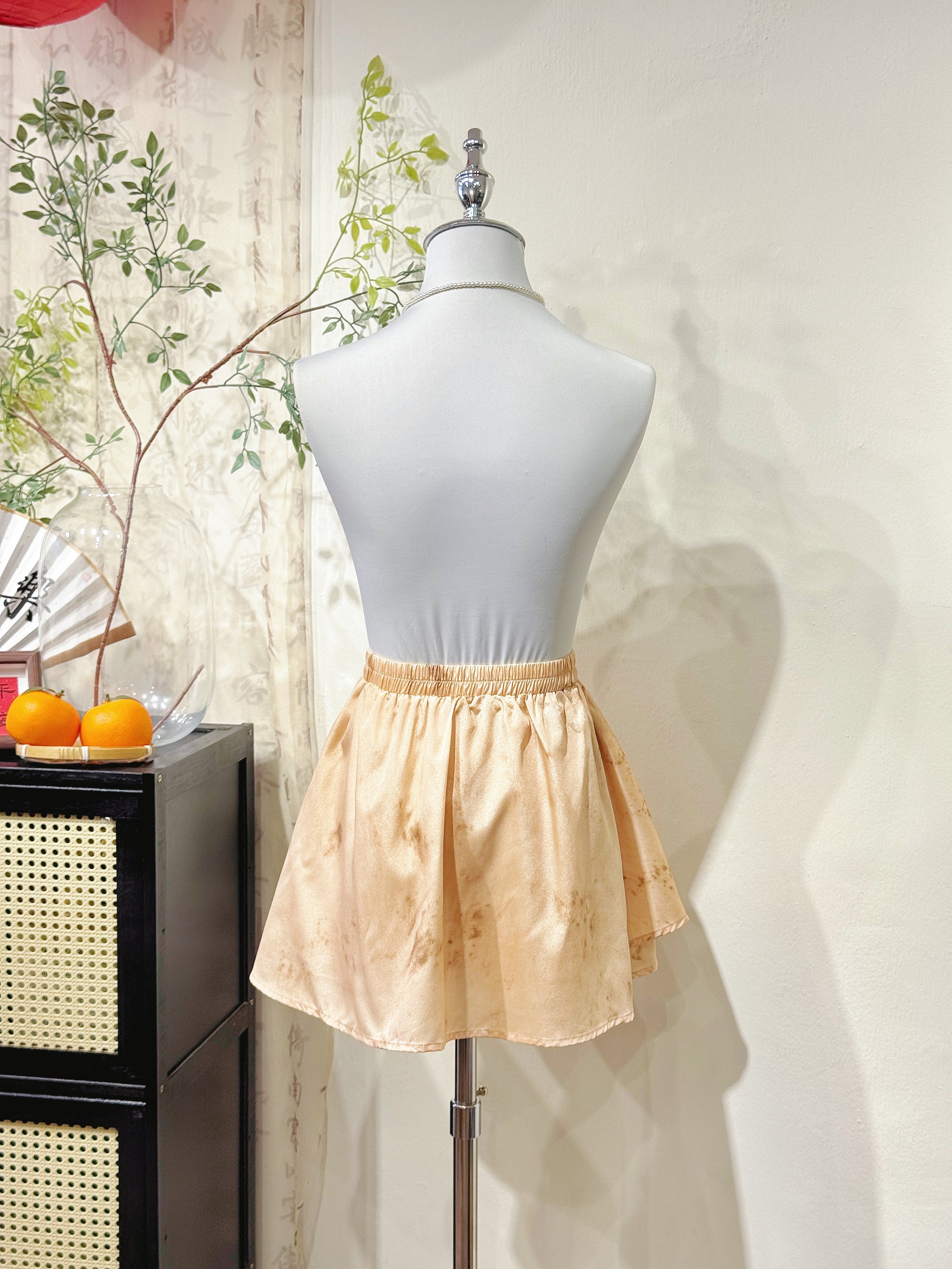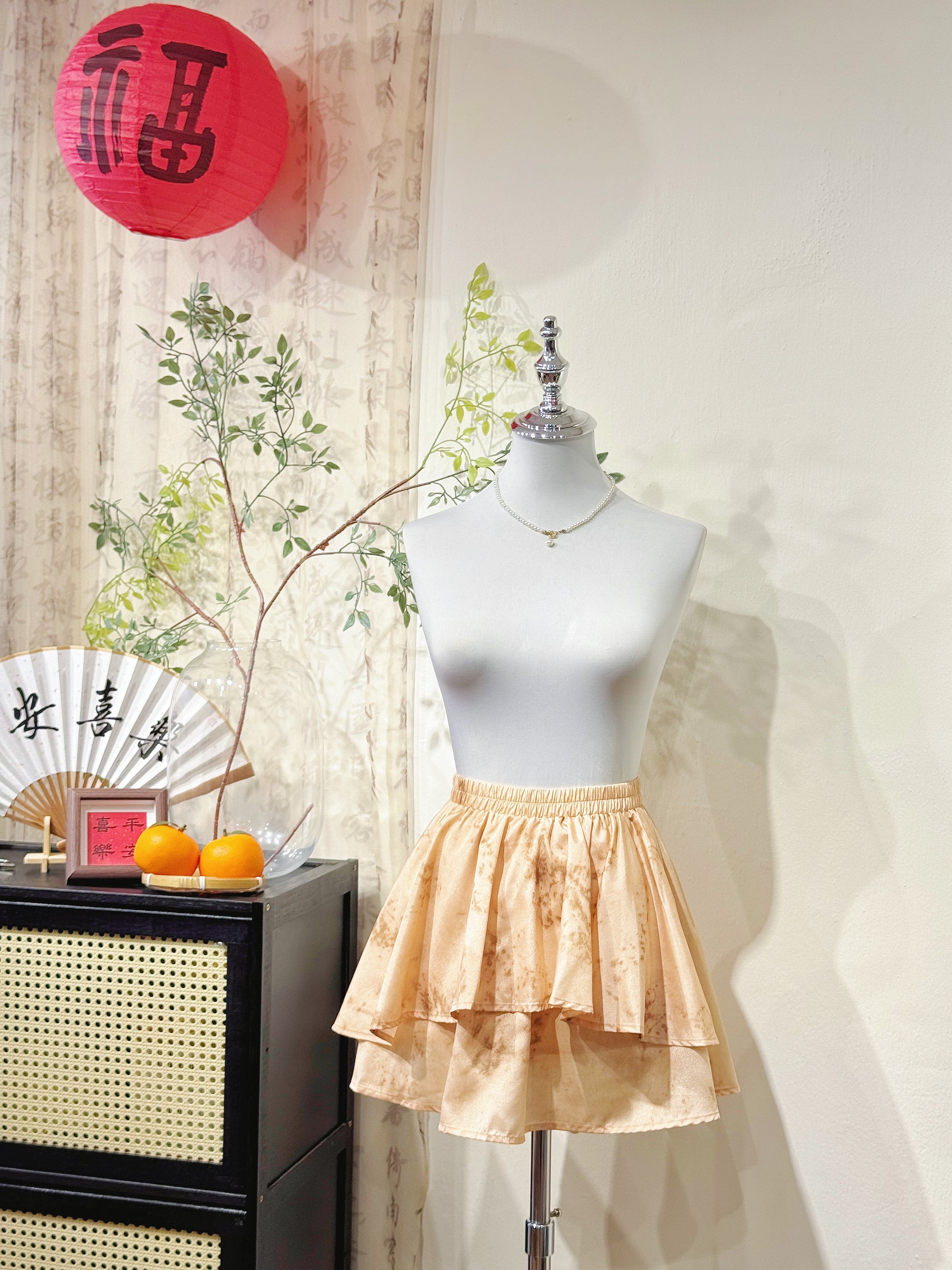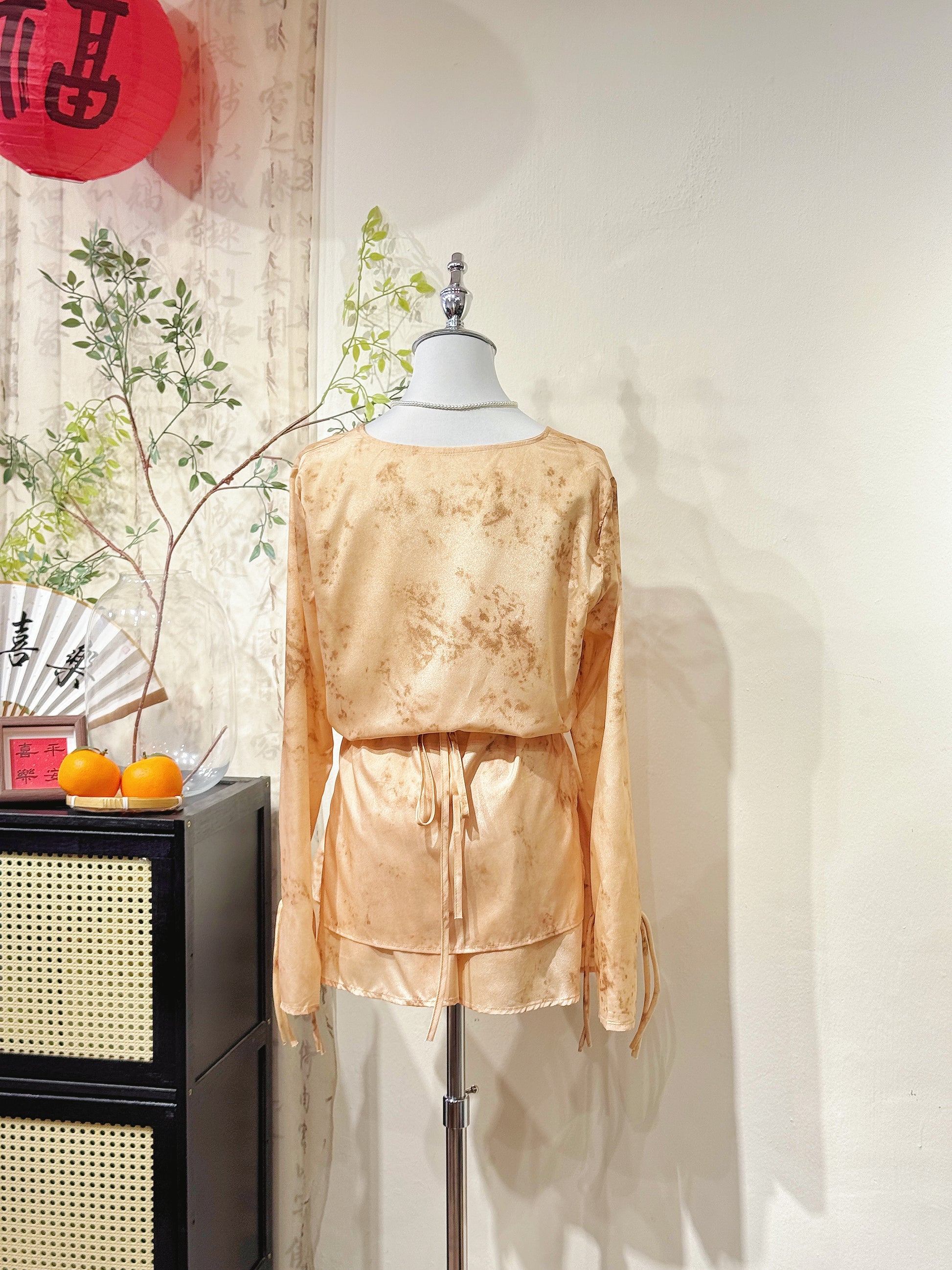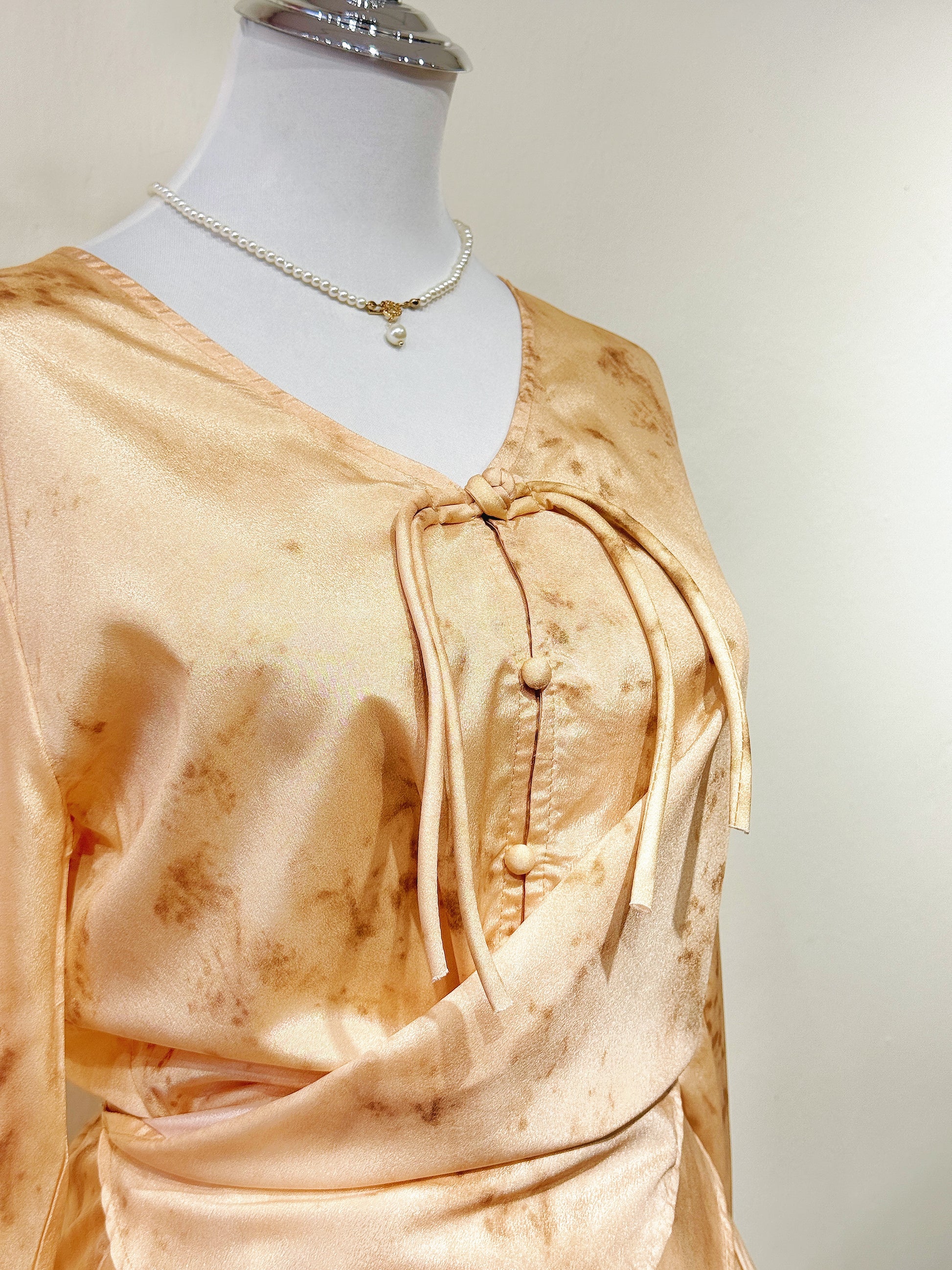 Long-sleeve V-neck top with front button closure and tassel-accented Chinese knot buttons on the sleeves. Features a long, wrap-back hem. Comes with a skirt featuring elastic waistband and inner shorts lining for comfort and coverage.